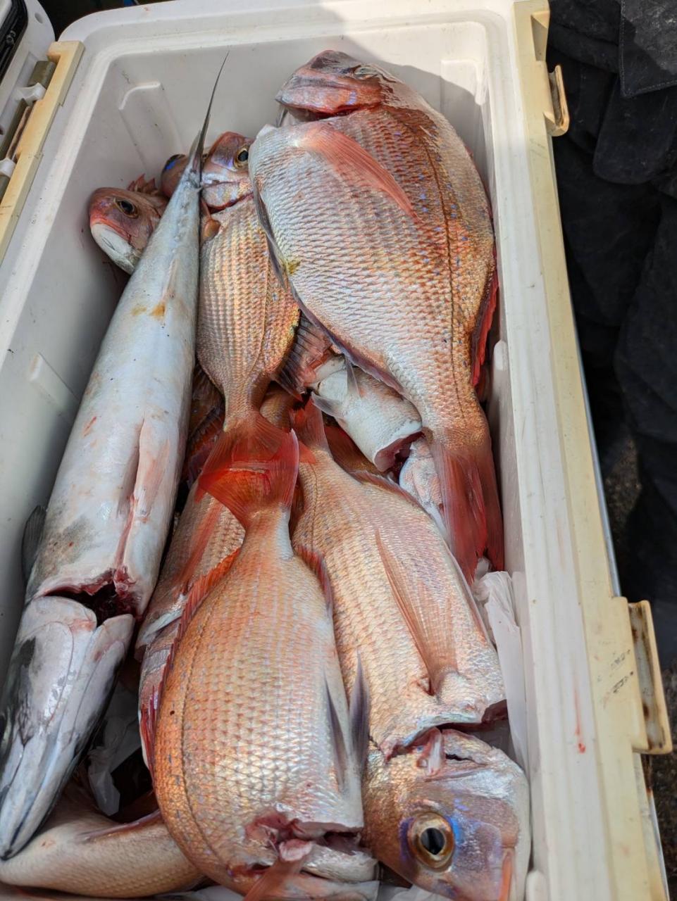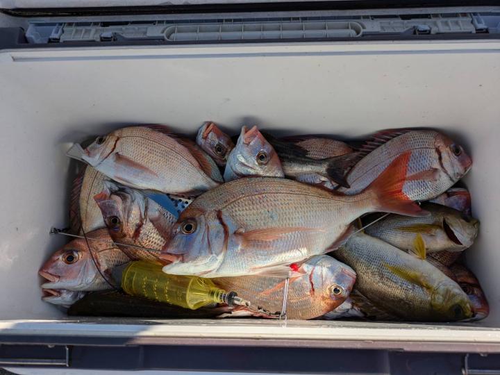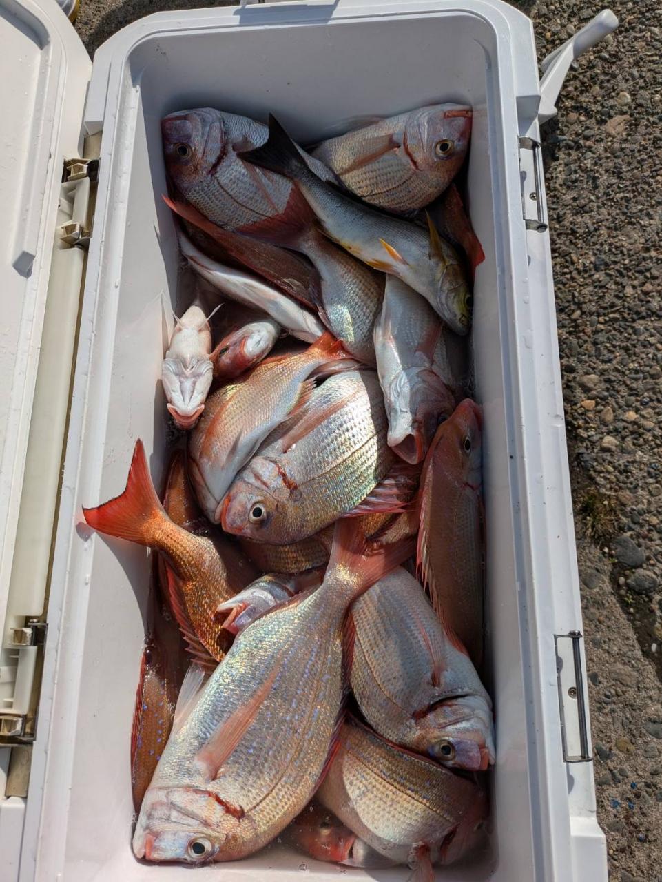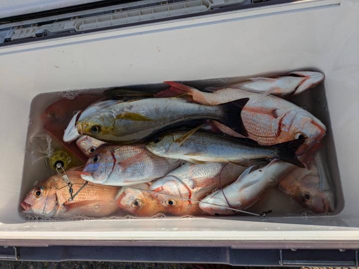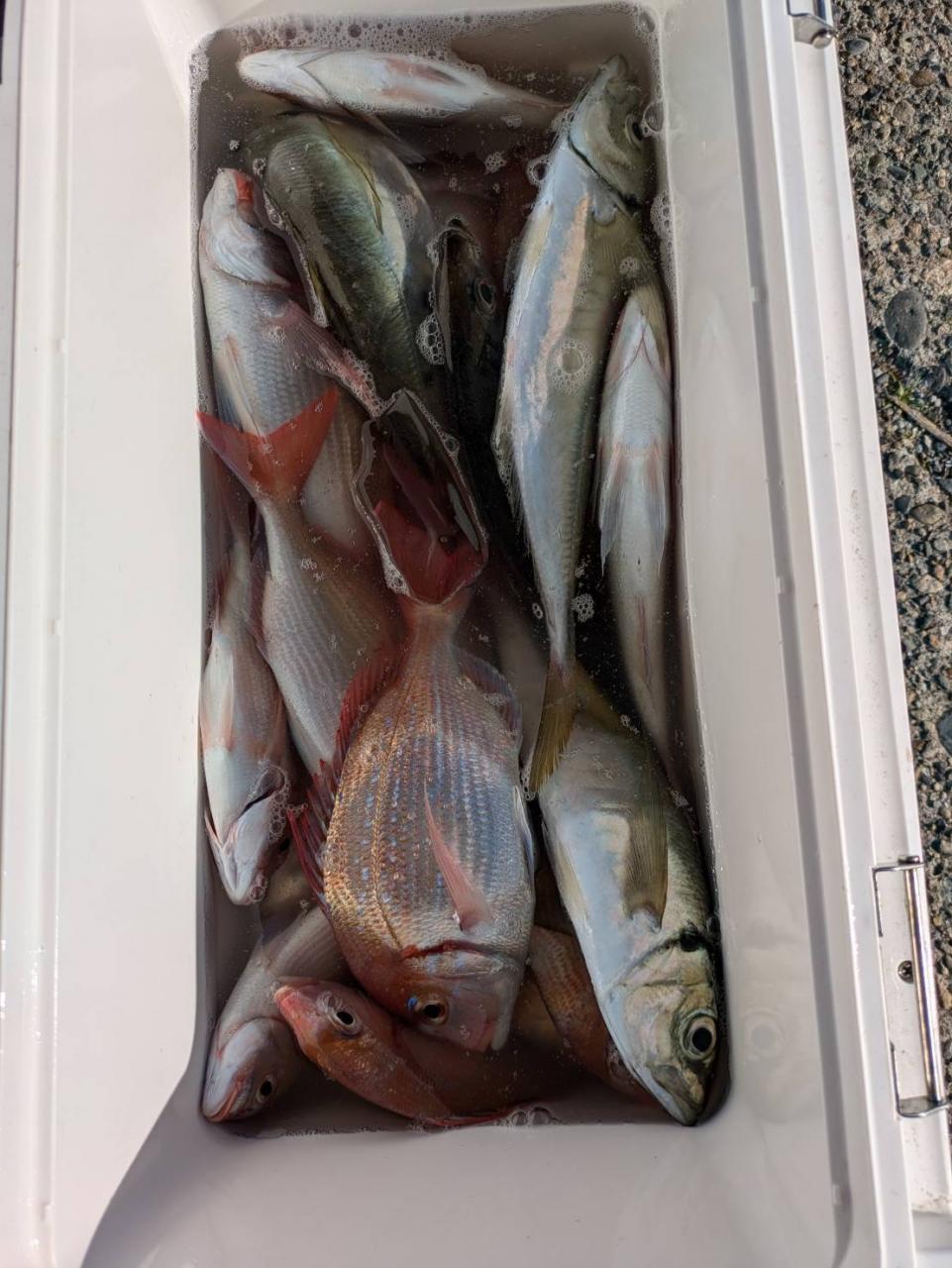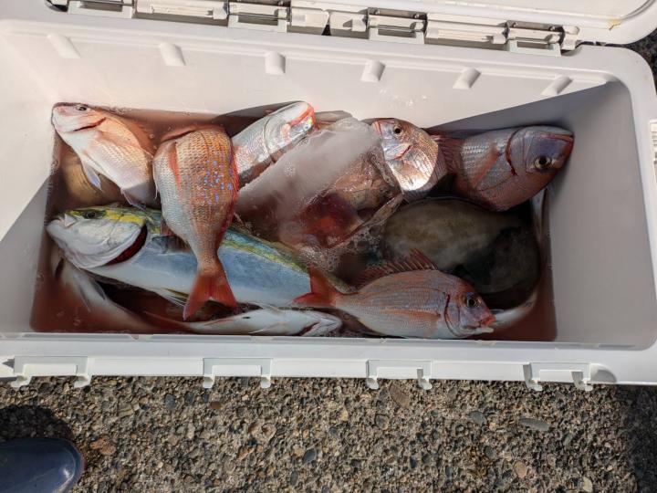 ごちゃごちゃの海で船酔いの方も多くなってしまい、全員ゲットなりませんでした。凪良くなれば数もアタリも増えてくると思います。