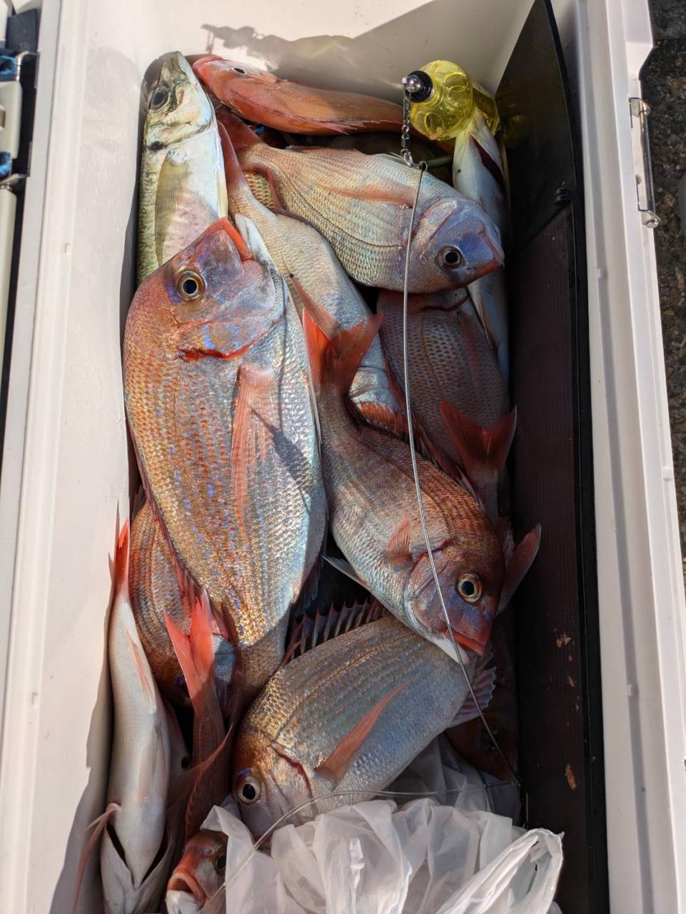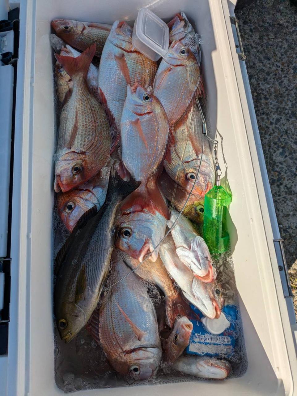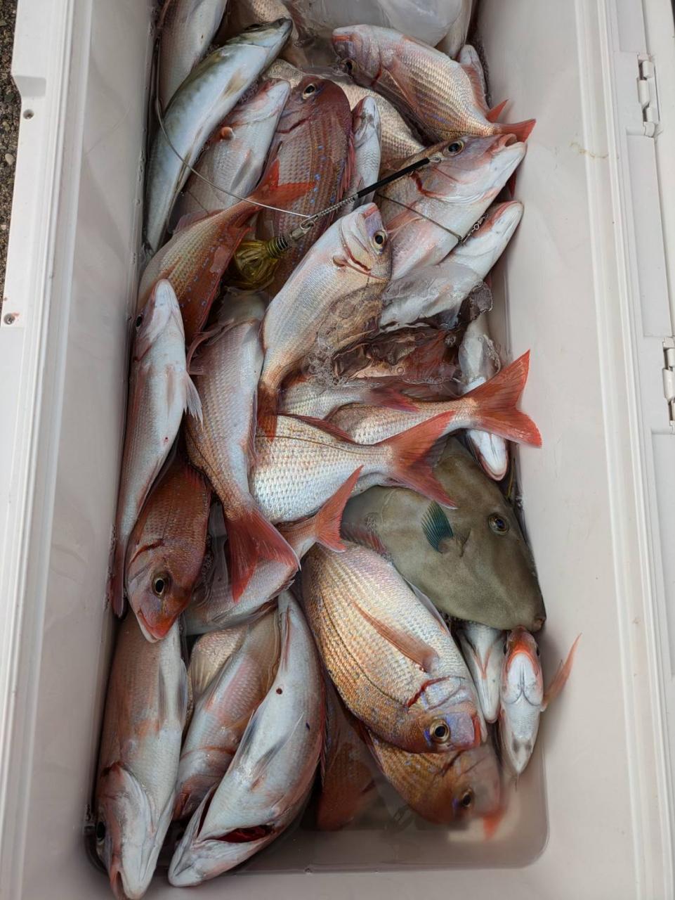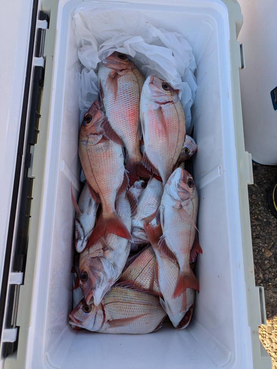 ごちゃごちゃの海で船酔いの方も多くなってしまい、全員ゲットなりませんでした。凪良くなれば数もアタリも増えてくると思います。